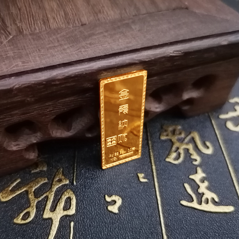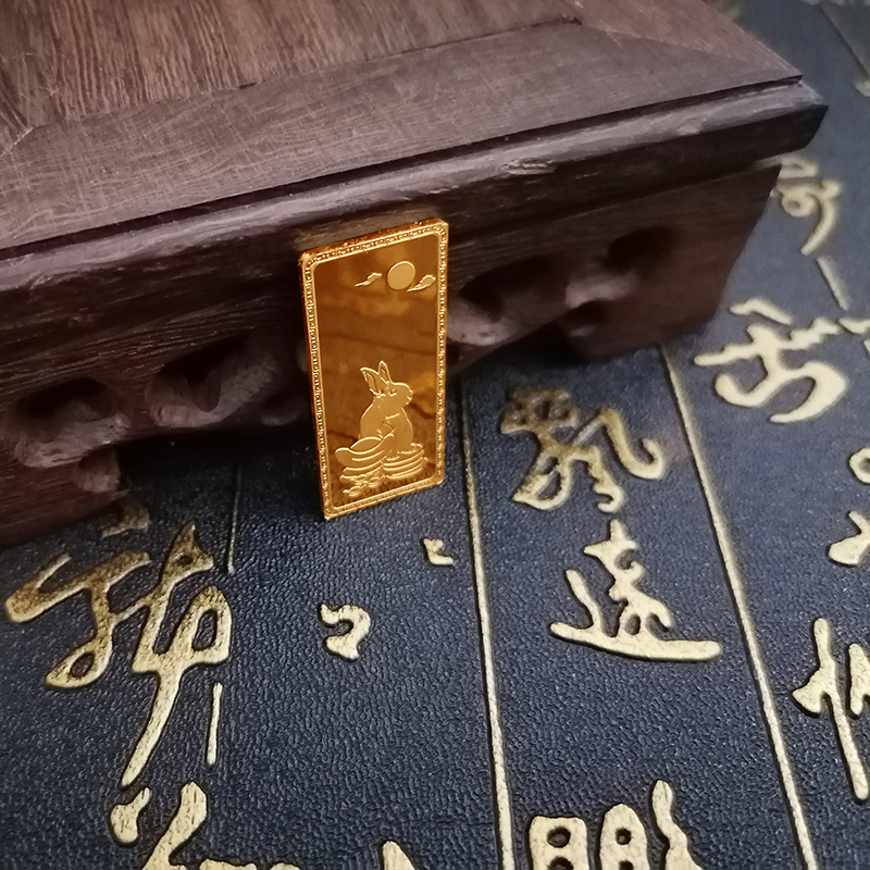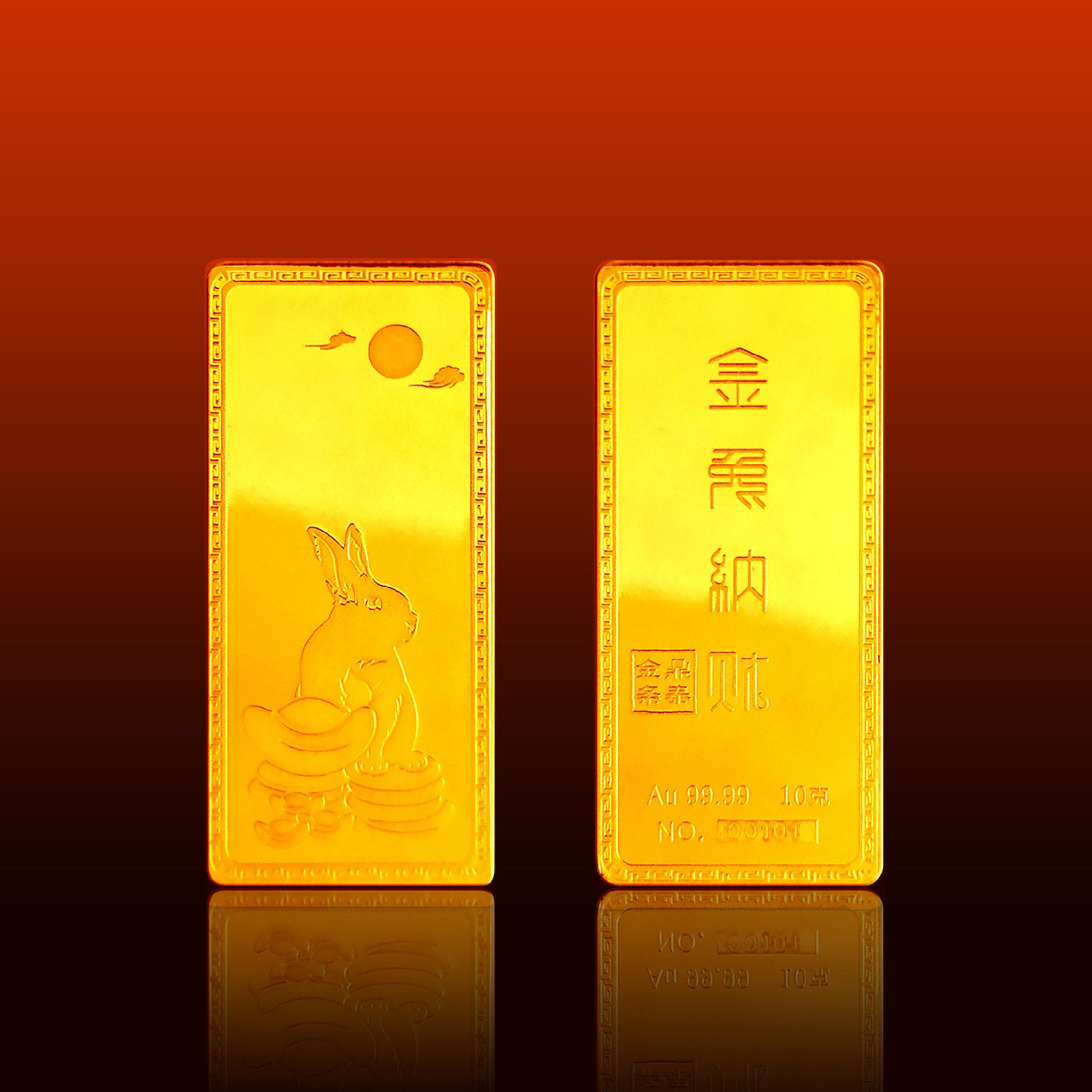 金兔纳财系列金条产品,采用油压工艺制造。正面图案为一只兔子蹲坐于金钱堆上,面前摆放起元宝的造型,兔子形态机敏警惕,头顶有环绕祥云的明月照耀。反面金兔纳财四字居中,鼎泰金条印章在旁,下方标注有金条成色、克重、编号等。整体设计寓意理财有道,纳财有方,事业丰顺,受福禄而身心灵动安康,鸿福绵长的美好祝愿。金条整体为镜面底,图案采用浮雕细砂工艺,对比效果清析,十分美观。