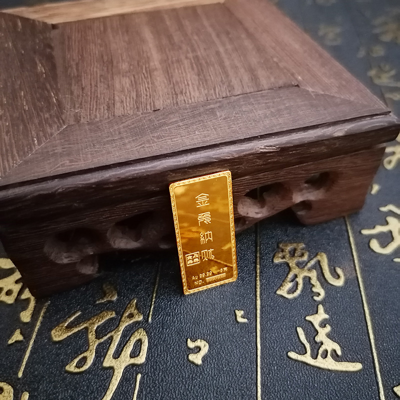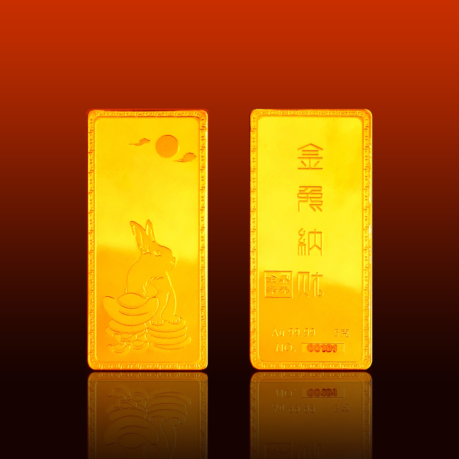 金兔纳财系列金条产品,采用油压工艺制造。正面图案为一只兔子蹲坐于金钱堆上,面前摆放起元宝的造型,兔子形态机敏警惕,头顶有环绕祥云的明月照耀。反面金兔纳财四字居中,鼎泰金条印章在旁,下方标注有金条成色、克重、编号等。整体设计寓意理财有道,纳财有方,事业丰顺,受福禄而身心灵动安康,鸿福绵长的美好祝愿。金条整体为镜面底,图案采用浮雕细砂工艺,对比效果清析,十分美观。