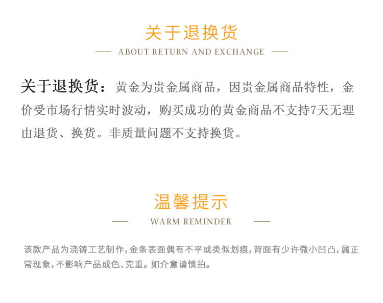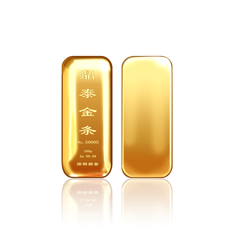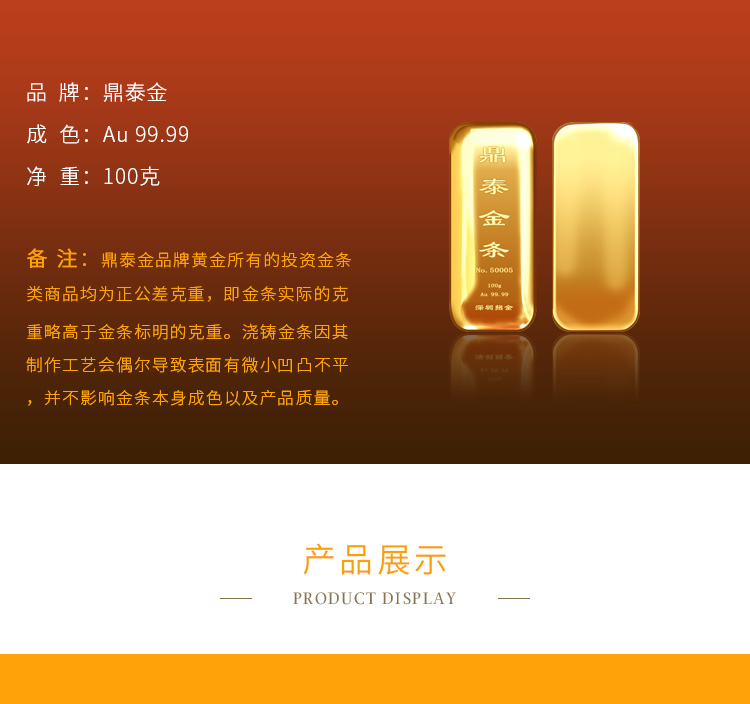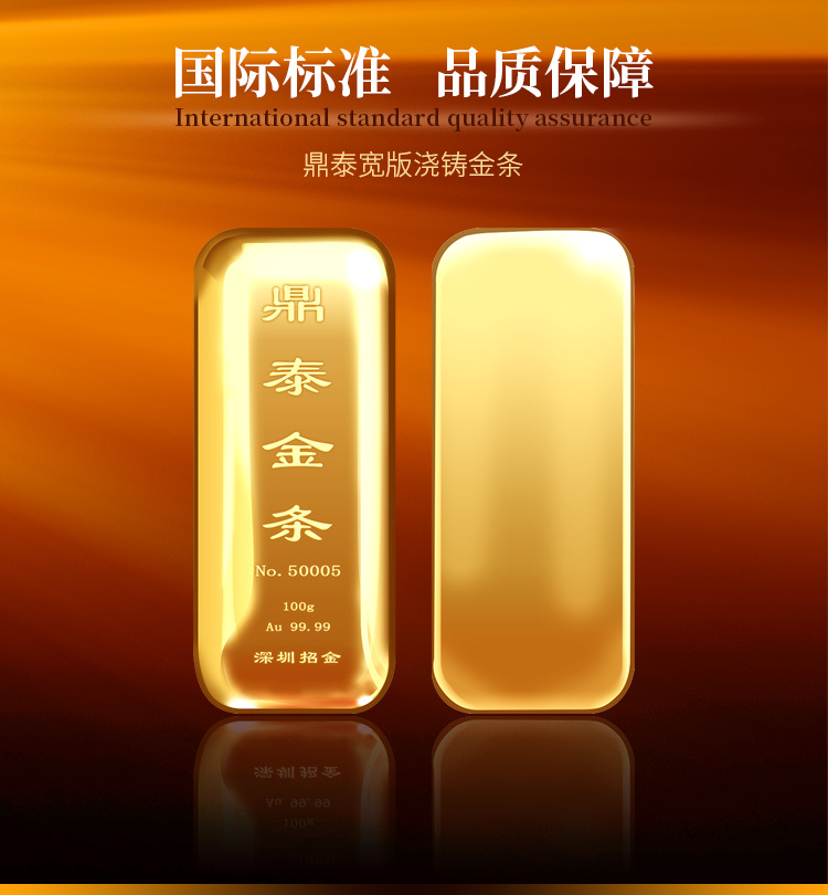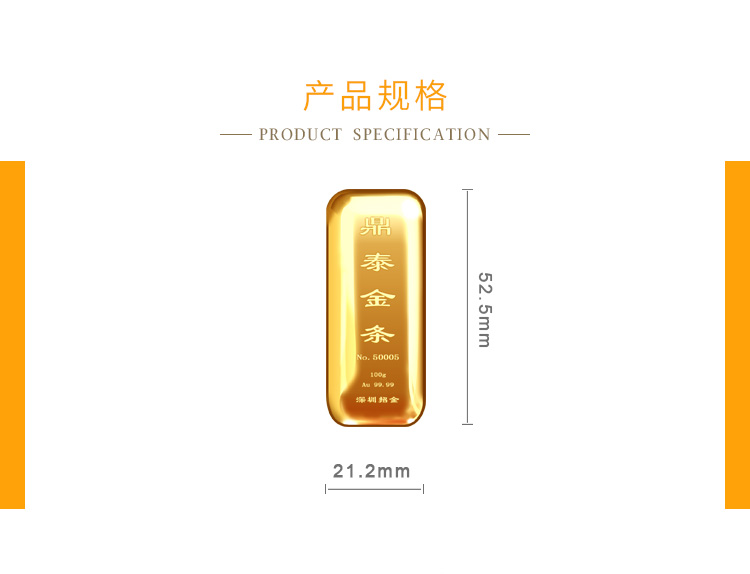 出品品牌为“鼎泰金”,经浇铸工艺制作,外观圆润,色度饱满,全流程严格按照上海黄金交易所标准制造完成,支持购回。规格尺寸上分为经典浇铸款、宽版浇铸款。金条正面标注成色、克重、编号等标识。