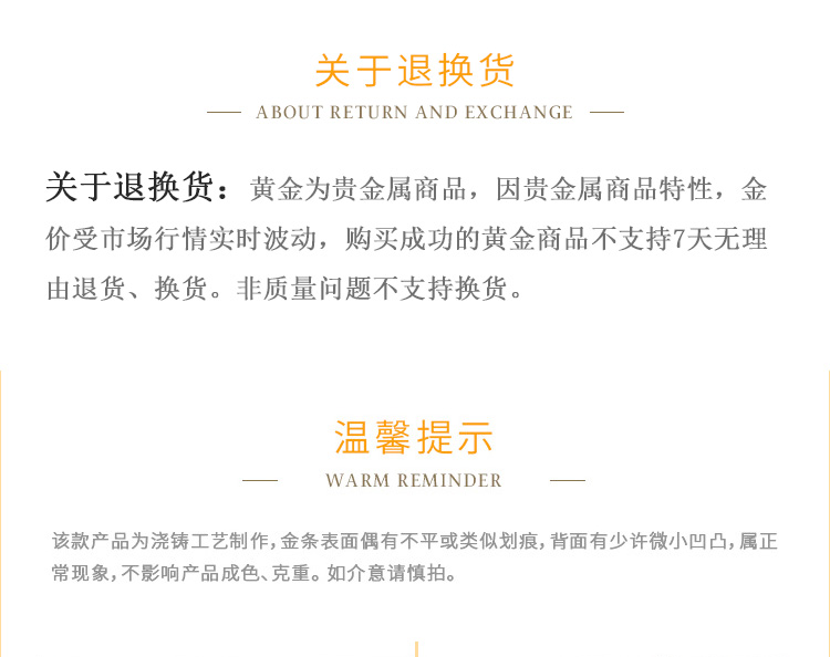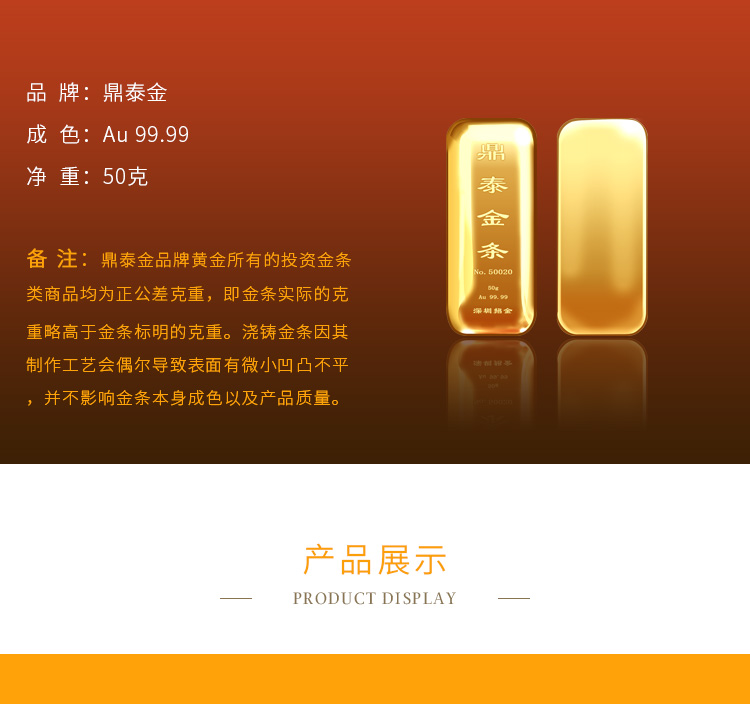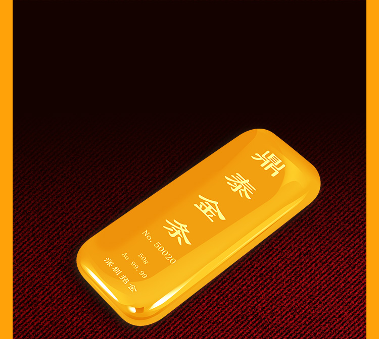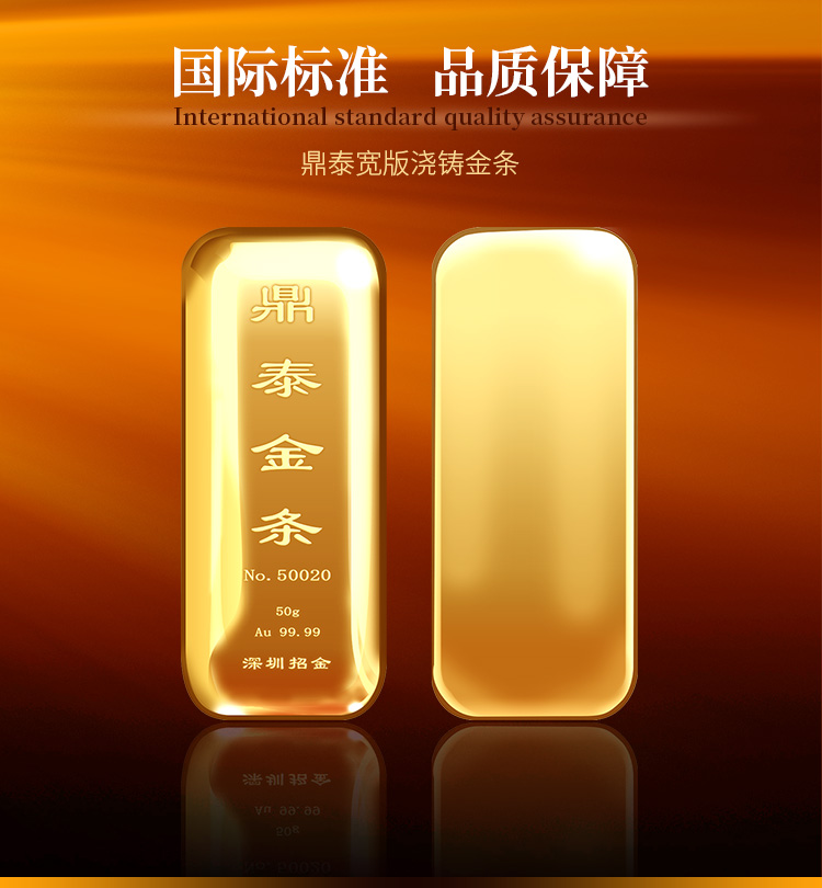 出品品牌为“鼎泰金”,经浇铸工艺制作,外观圆润,色度饱满,全流程严格按照上海黄金交易所标准制造完成,支持购回。规格尺寸上分为经典浇铸款、宽版浇铸款。金条正面标注成色、克重、编号等标识。