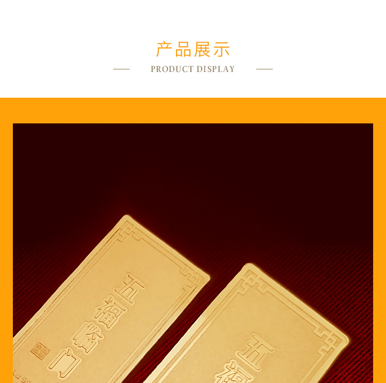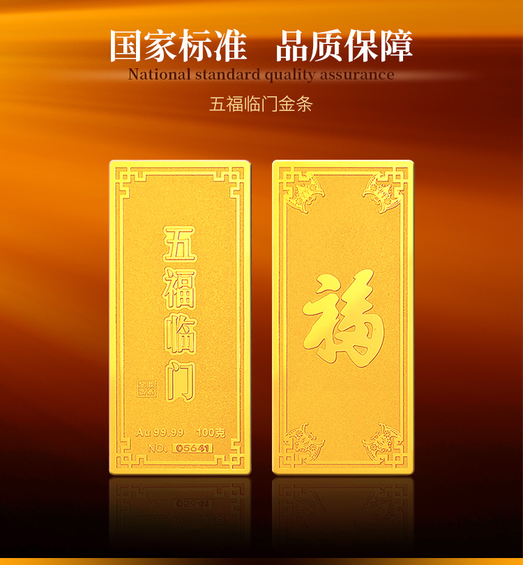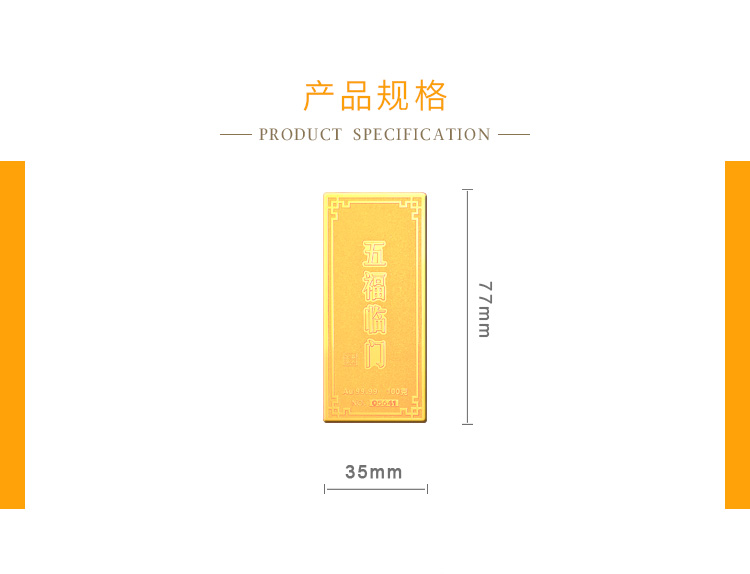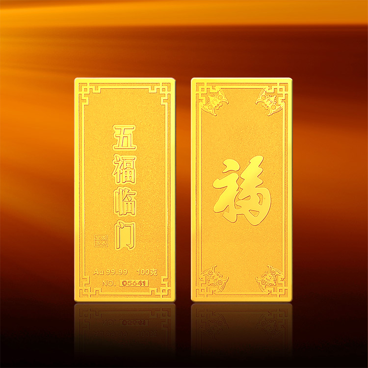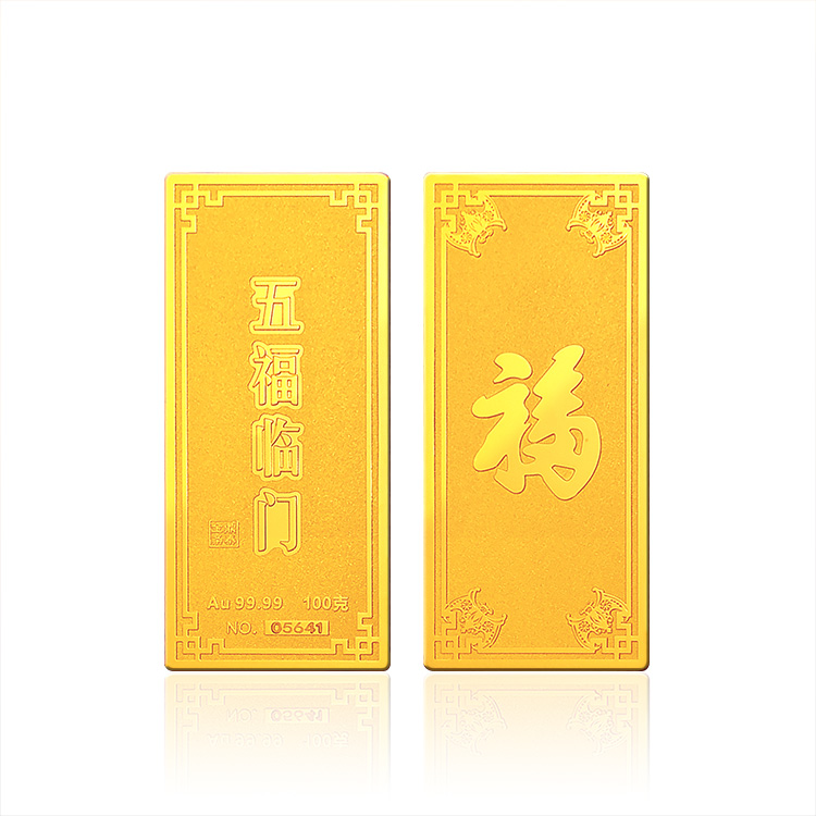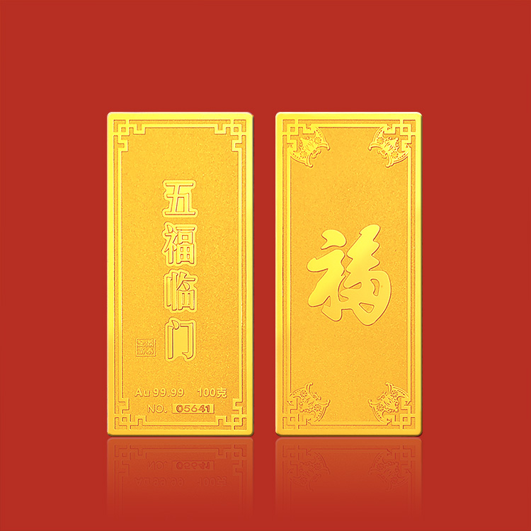 五福临门系列金条产品,采用油压工艺制造。正面图案以康熙手书天下第一福的福字为主题,与四周向心蝙蝠(通福)构成五福临门的美好寓意,反面有五福临门文字主题及金条成色,克重,编号等标示。