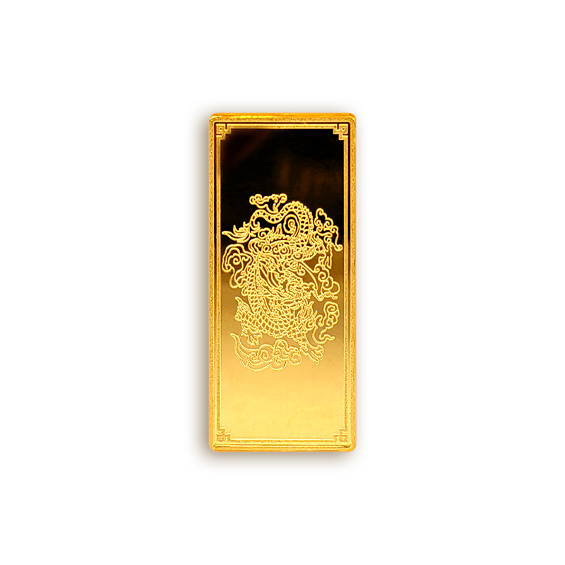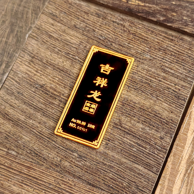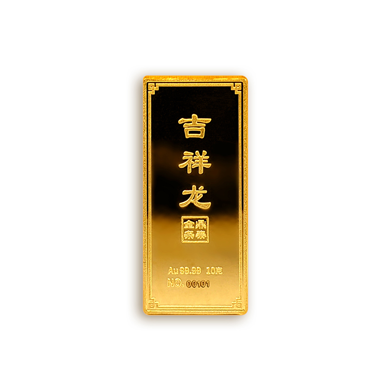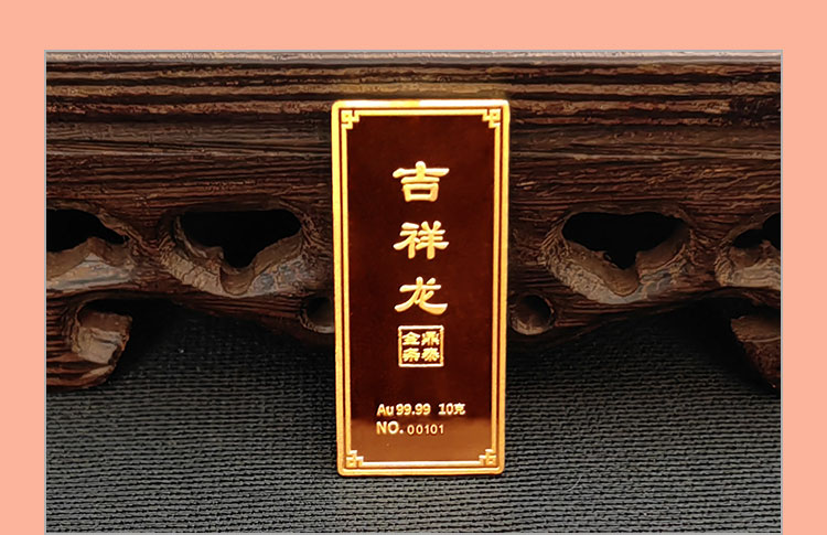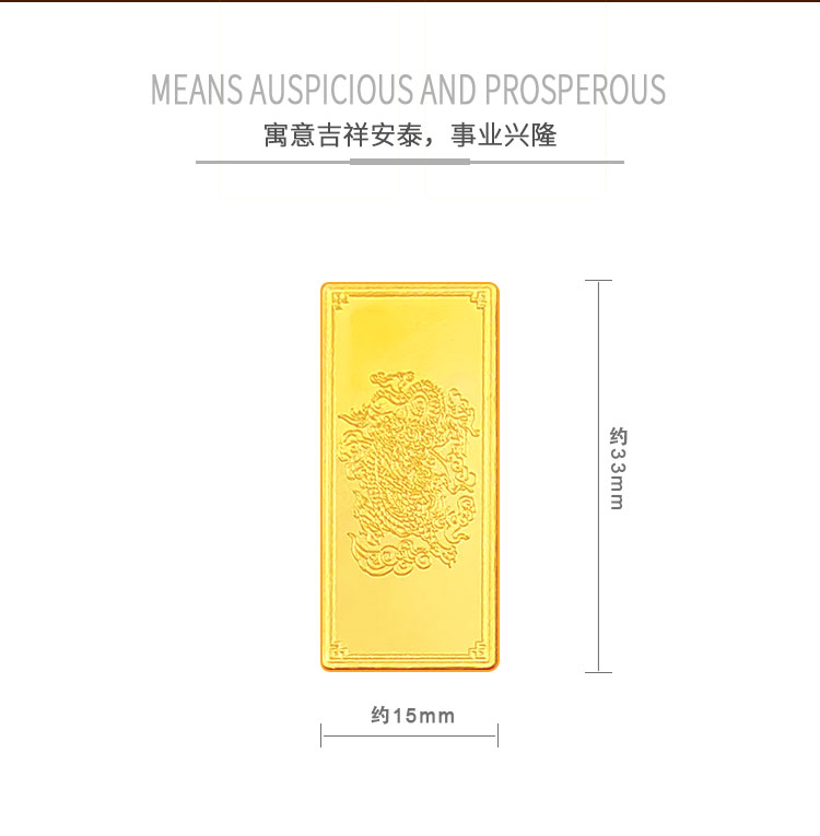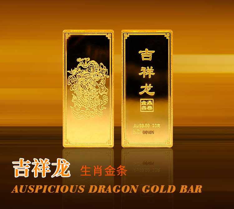 吉祥龙生肖金条以云中行龙,龙游云从为设计主题,采用油压工艺制造。金条正面主体为祥云之间的一条金龙,游走于云海之中睥睨天下的造型。龙形为下探游龙,,身姿弯蜒,健美有力。身边为祥云簇拥环绕,鳞甲飞扬。反面吉祥龙三字居中,四周回角边,下方标注有金条成色、克重、编号等。整体设计寓意龙行天下,财通八方,事业兴旺发达的美好祝愿。