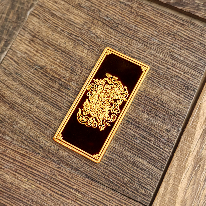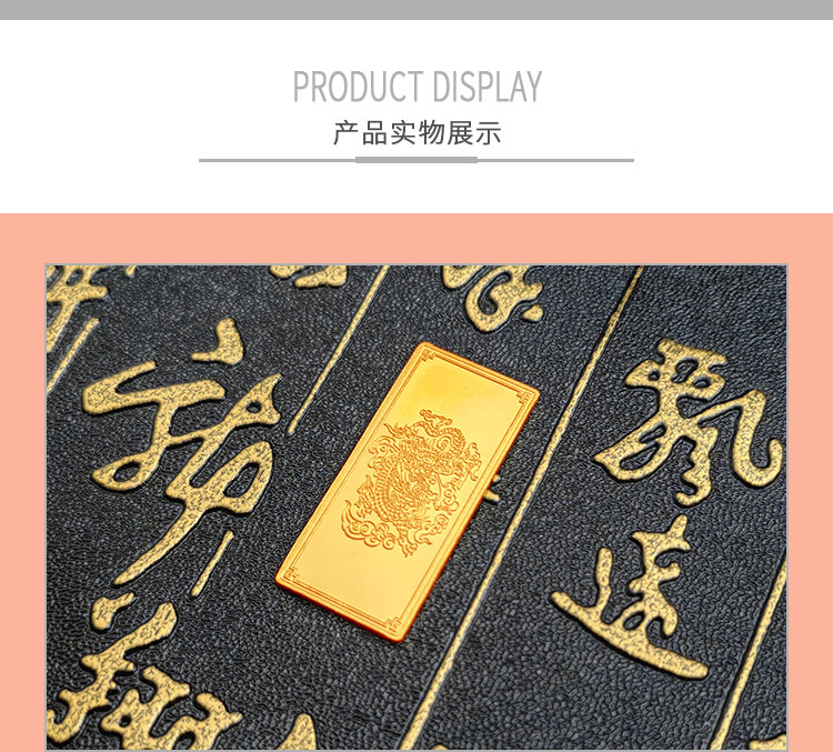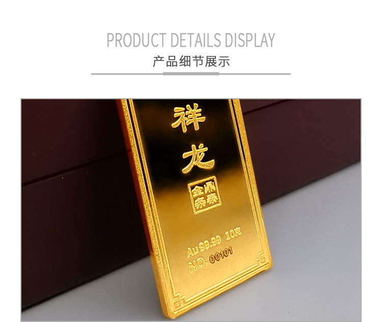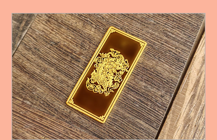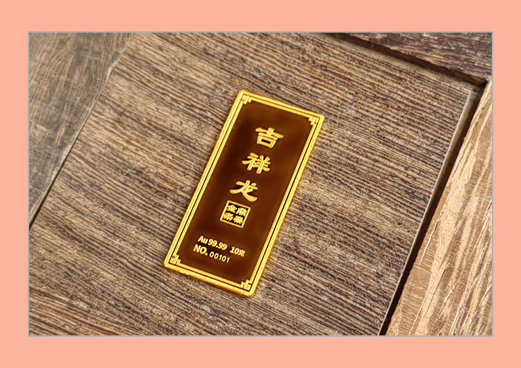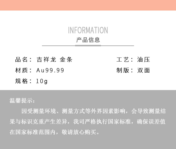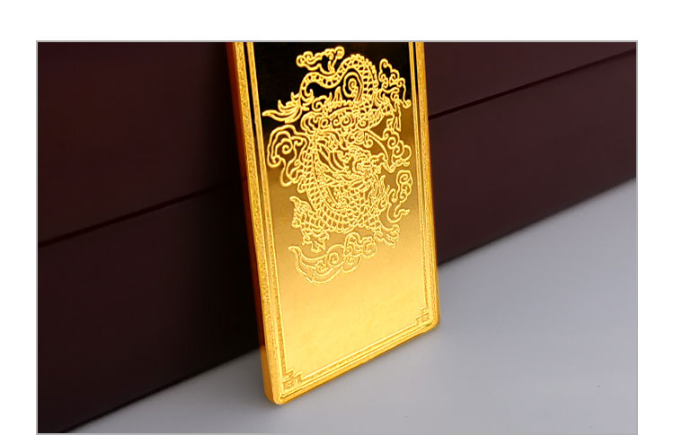 吉祥龙生肖金条以云中行龙,龙游云从为设计主题,采用油压工艺制造。金条正面主体为祥云之间的一条金龙,游走于云海之中睥睨天下的造型。龙形为下探游龙,,身姿弯蜒,健美有力。身边为祥云簇拥环绕,鳞甲飞扬。反面吉祥龙三字居中,四周回角边,下方标注有金条成色、克重、编号等。整体设计寓意龙行天下,财通八方,事业兴旺发达的美好祝愿。