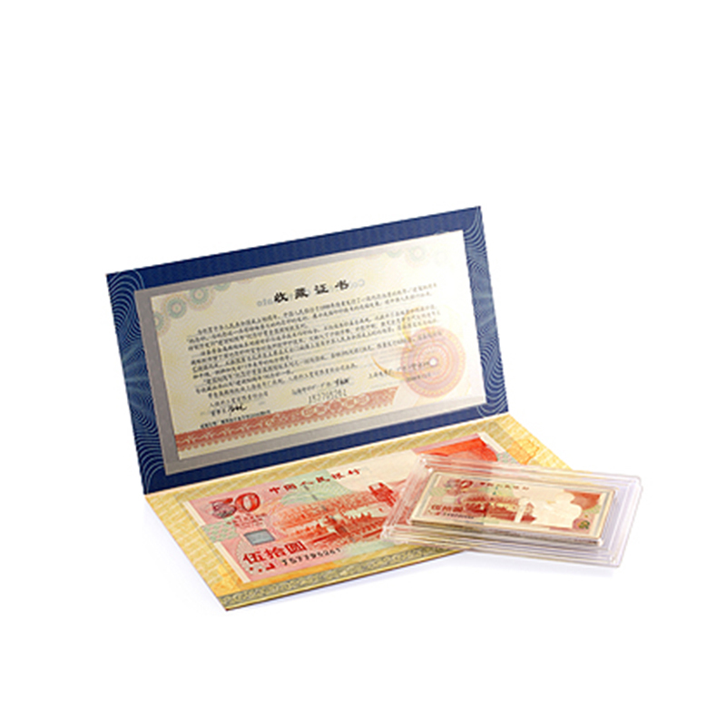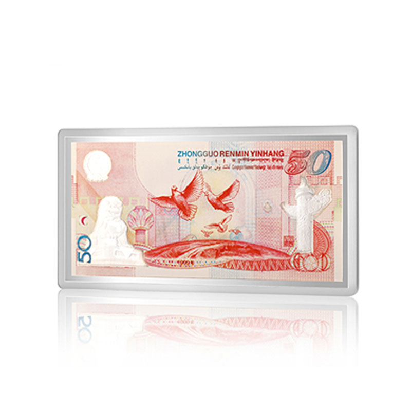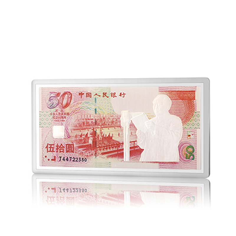 为祝贺中华人民共和国成立50周年,中国人民银行于1999年隆重发行了一款纪念性质的纸币---“建国50周年”纪念钞。为纪念这一具有特殊意义的纪念钞的发行,展示我国印钞技术的迅猛发展,经中国人民银行批准,特制作发行:“建国50周年”纪念钞贵金属微缩版系列。该套贵金属微缩版系列将印钞与造币技术巧妙结合,不仅使原钞真实再现,还提升了其观赏和收藏价值。微缩版保留了原纪念钞所富含的高科技印钞技术,又融入了沙面浮雕、彩色印制、激光全息等当代尖端造币工艺精铸而成。该贵金属微缩纯金版,含99.9%纯金198克,限量发行1000套;银镶金版含99.9%纯金18克,含99.9%纯银128克.限量发行3000套;纯银版含99.9%纯银128克,限量发行8000套。每套随附编号收藏证书及“建国50周年”纪念钞一张。贵金属微缩版由上海造币厂承制,人银科工贸有限责任公司出品。是唯一一款由人银科工贸有限责任公司、上海造币厂、上海印钞厂联合发行的产品。产品极具收藏观赏价值。